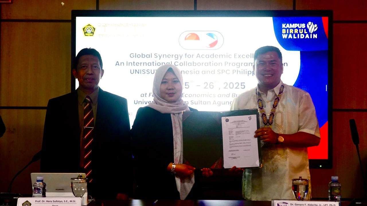 Prodi Akuntansi FEB Unissula menggelar kolaborasi riset internasional. Hadir Dr Genaro F. Alderite Jr LPT PhD yang berbicara tentang kesiapan transformasi digital dan kinerja keberlanjutan UMKM di Indonesia dan Filipina. Dalam momen tersebut juga dilakukan penandatangan kerjasama dengan Dekan School of Business Management, Education, Arts, and Sciences (SBMEAS) San Pedro College Filipina.