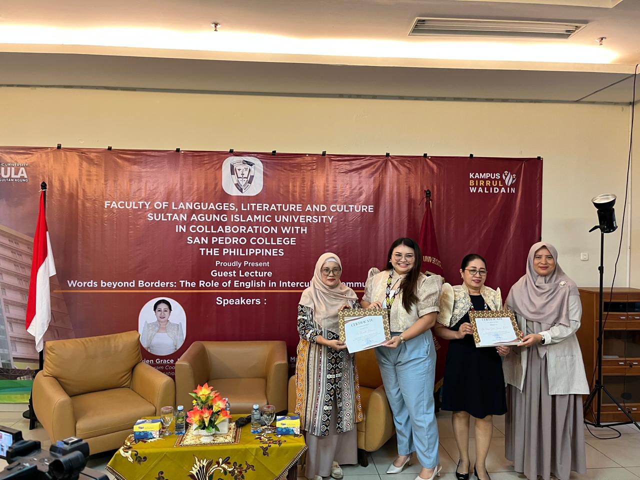 Fakultas Bahasa, Sastra, dan Budaya Unissula menggelar kuliah tamu The Role of English in Intercultural Communications. Dengan dua narasumber dari San Pedro College Filipina, Dr Vivien Grace Jubahib, LPT (Program Coordinator, Teacher Education) dan Ms Romelle Hilamon (Global Mobility Coordinator, Internationalization and Linkages Office), Jumat (25/7/2025).